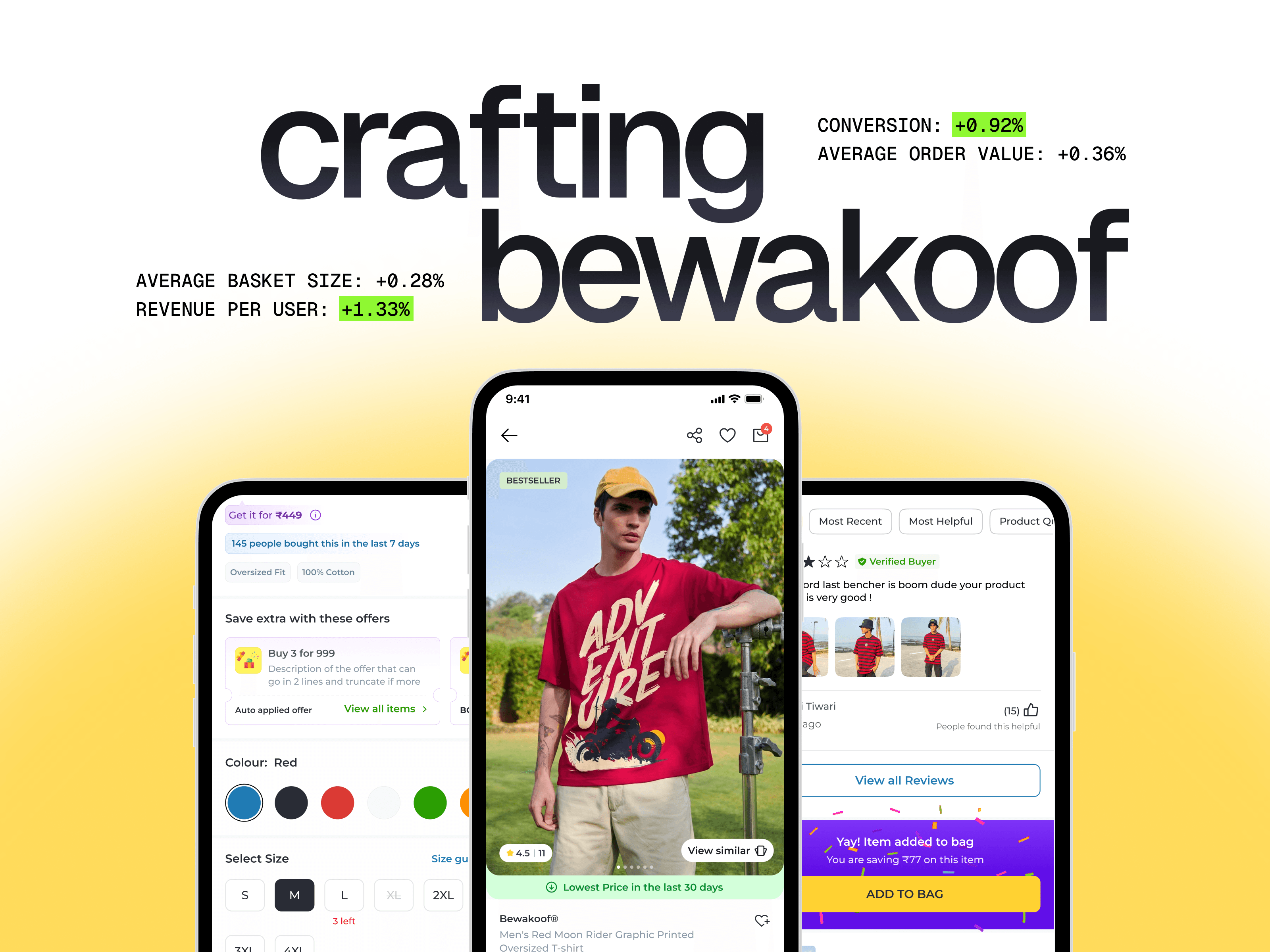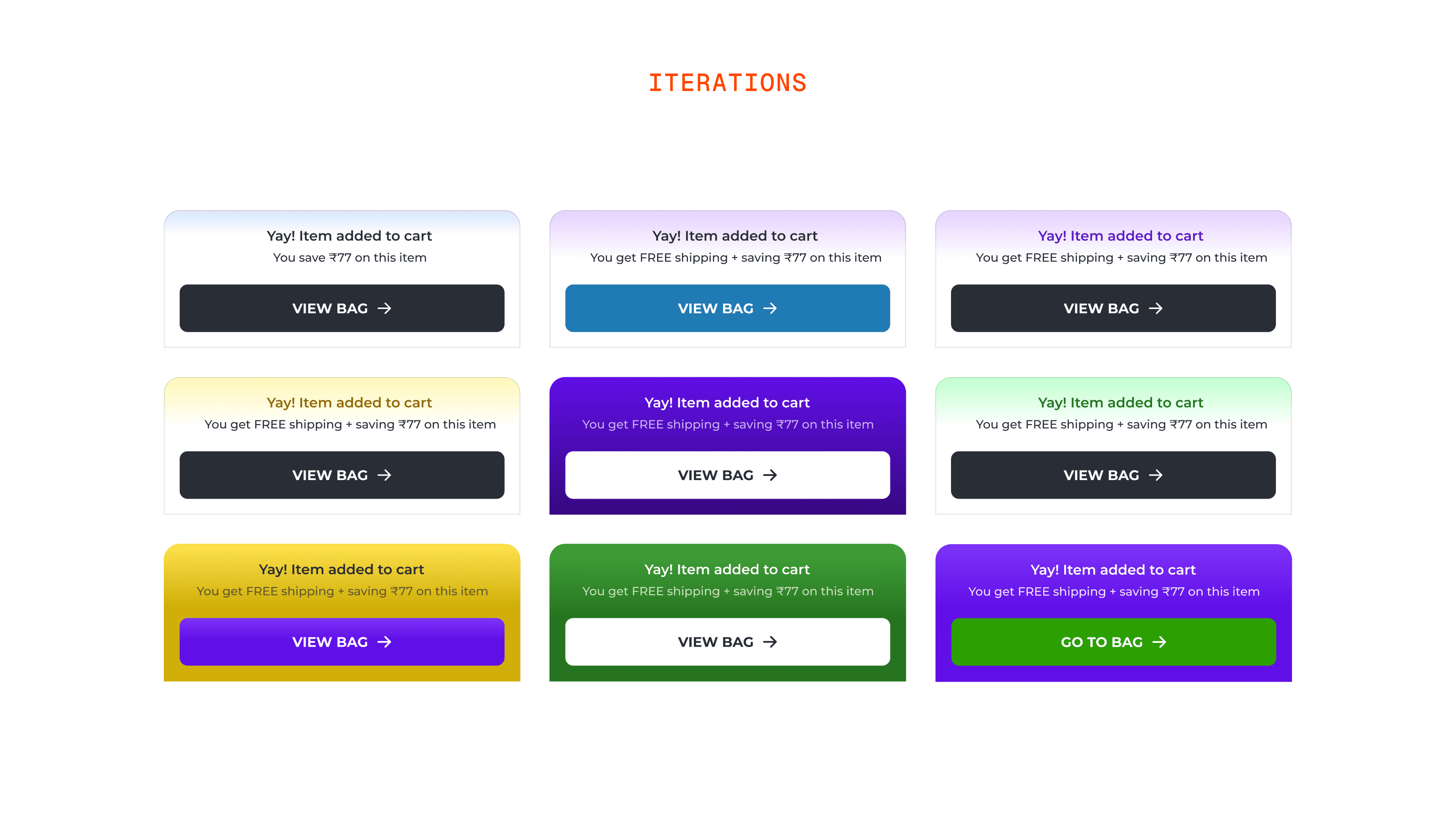 Colors: On colors, I went through a lot of variations before landing on purple and green. Purple was not a Bewakoof brand color at the time. I was working on a few things simultaneously including how the brand should communicate offers and coupons, and I made a call to introduce purple as the color for anything offer related across the product. It was bold, rich, and had never been used before so it would stand out. Green for the "Go to Bag" button was straightforward. It universally signals success, confirmation, and safe to proceed.
