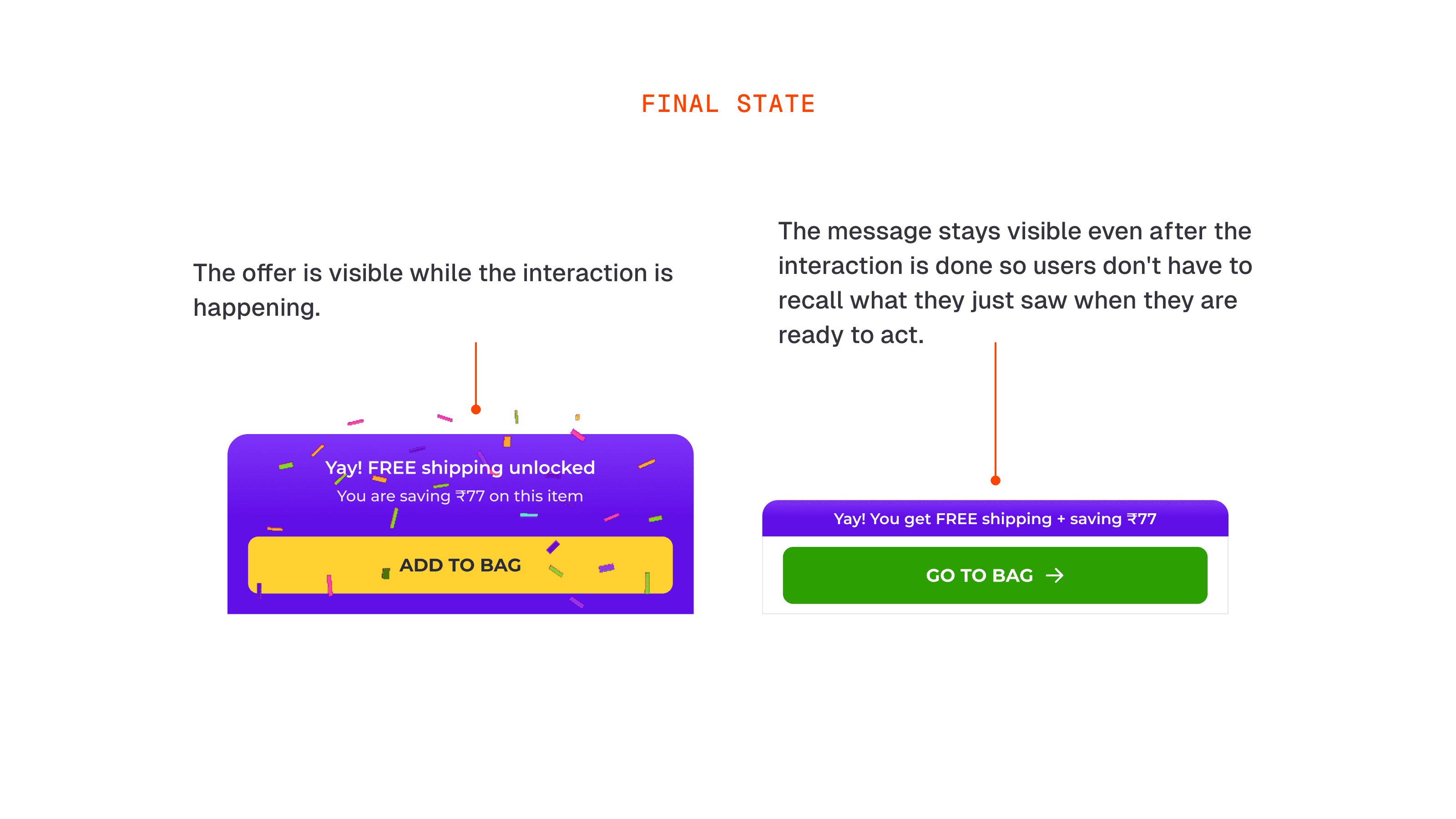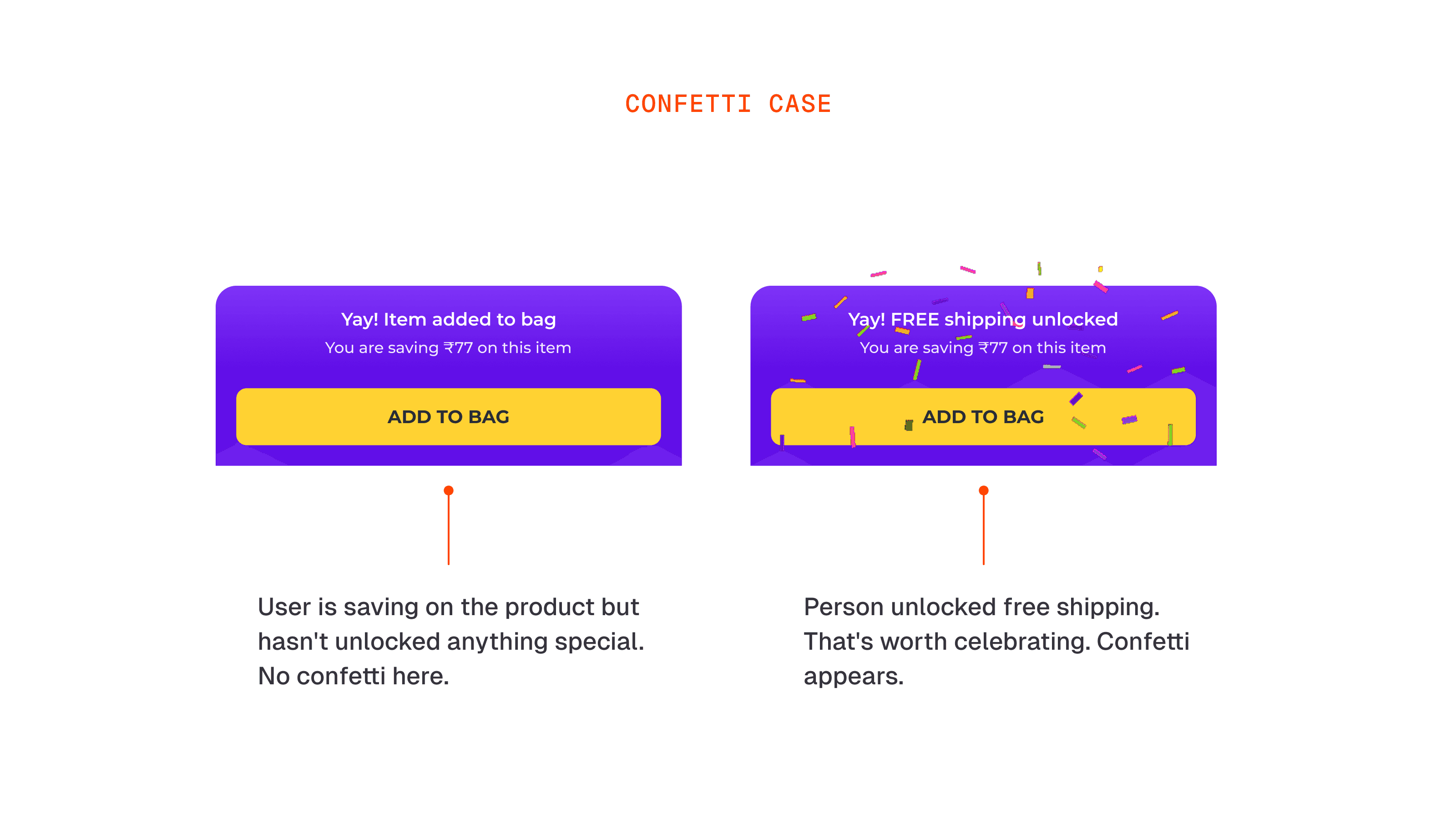 Confetti Case: One decision we made early was around the confetti. It only appears when the user has genuinely unlocked something, free shipping, a coupon, an offer. It does not appear when we are just showing basic savings. The reasoning was simple, you do not throw a party when nothing special has happened. Celebrating a standard price cut would have made the confetti feel cheap and over time users would stop responding to it.