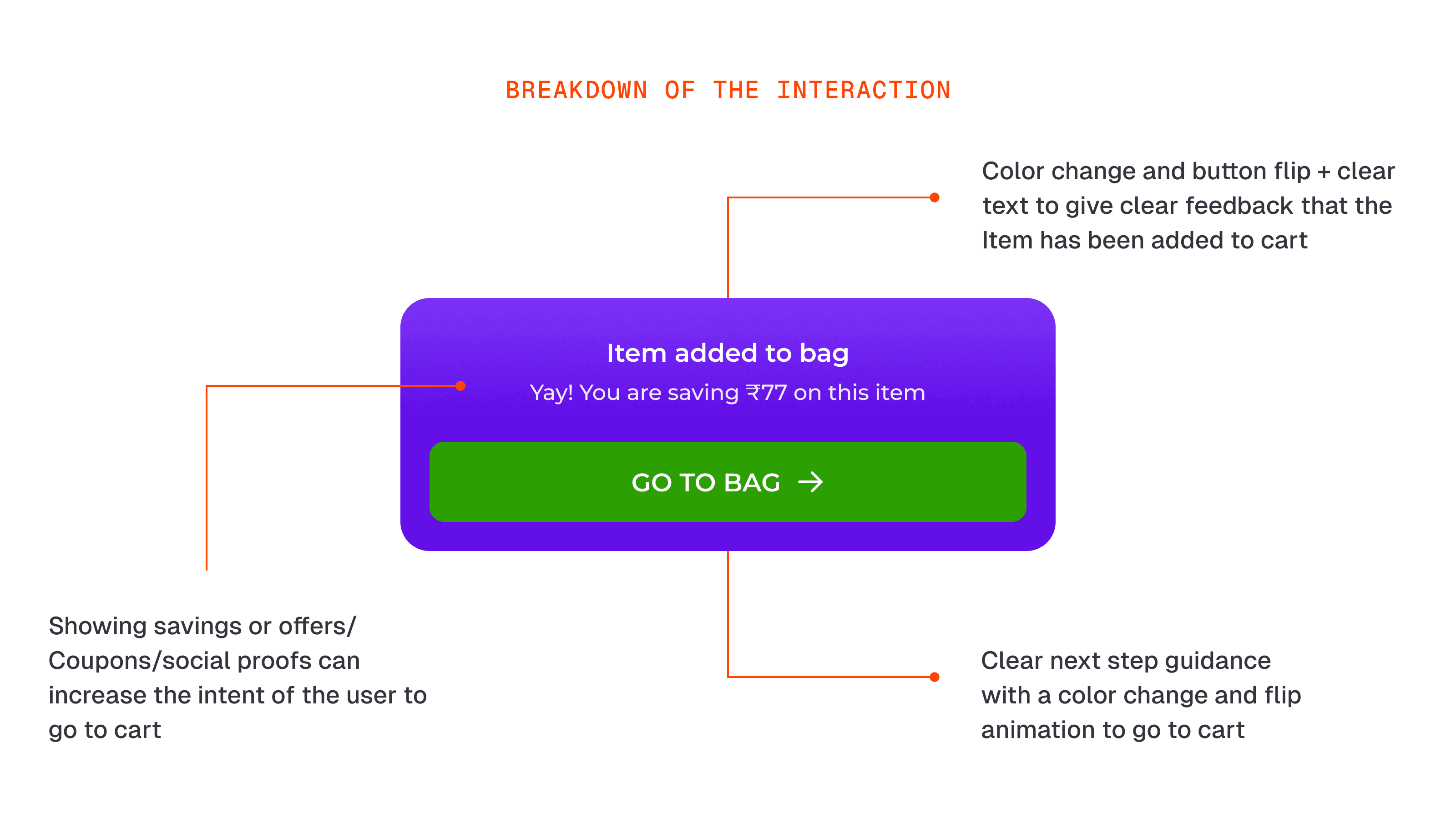 Final State Design: The message in the settled state was a deliberate call I made. After the animation ends and the button has flipped, the contextual message stays visible above the "Go to Bag" button. I did not want users to have to remember what they saw during the animation at the exact moment they need to decide whether to go to cart. Keeping it visible means the motivation is still there when it matters most.